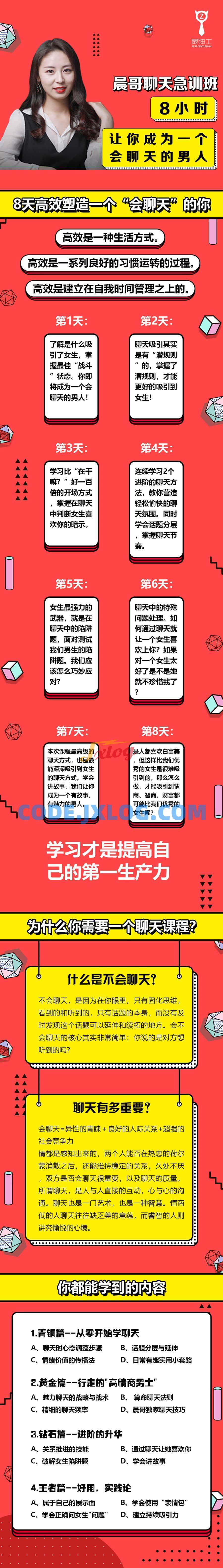 结合心理学、社会学的聊天急训班,浓缩了5年内行业所有聊天知识,快速让你了解聊天中的案例与关键知识。在8个小时的学习时间你让你成为一个会聊天的男人!