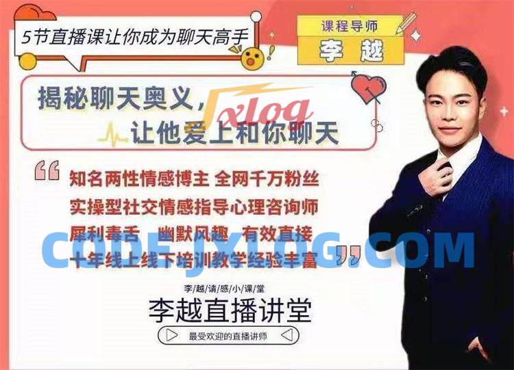 《李越聊天博弈2.0版,5节直播课让你成为聊天高手》课程导师:李越,揭秘聊天奥义让他爱上和你聊天!聊天底层逻辑分析+方法论指导,教你洞察男性心理,多场景案例实操解析,让你迅速成为聊天高手,高情商聊天话术,让你沟通表达更有魅力。助你掌握与男人说话的艺术,让感情升温,让关系有进展掌握底线与需求的表达,获得值得拥有的尊重与男人的付出和投入你将成为一个更有趣的人,一个行走的话题库,再也不怕没话聊的尴尬,成为一个人见人爱的高情商沟通者。