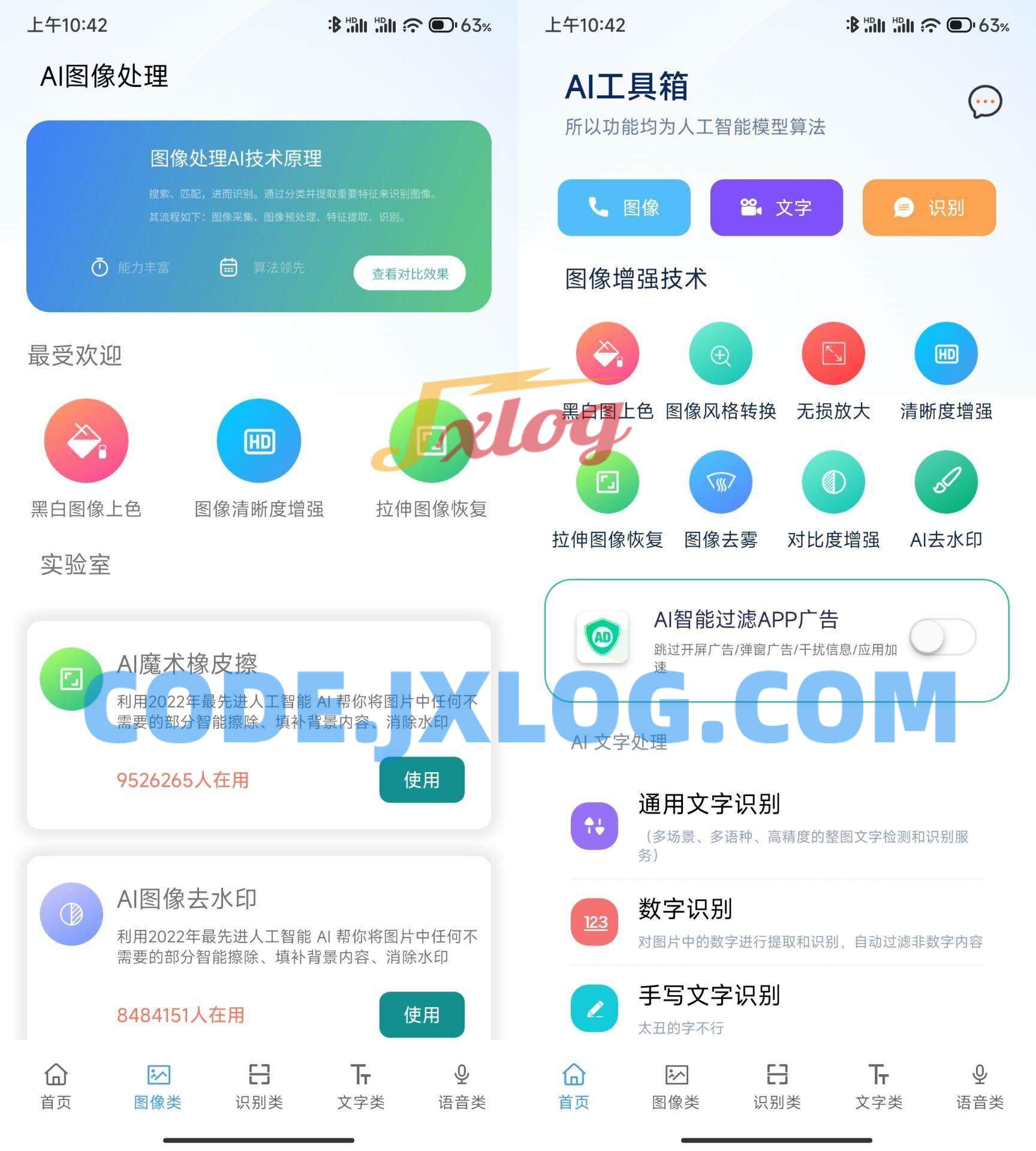 图像类工具:黑白上色、清晰度增强、对比度增强、色彩增强、风格转换、人像动漫化、人像背景分离、图像去雾、无损放大、拉伸恢复、AI魔术橡皮擦、AI去水印……