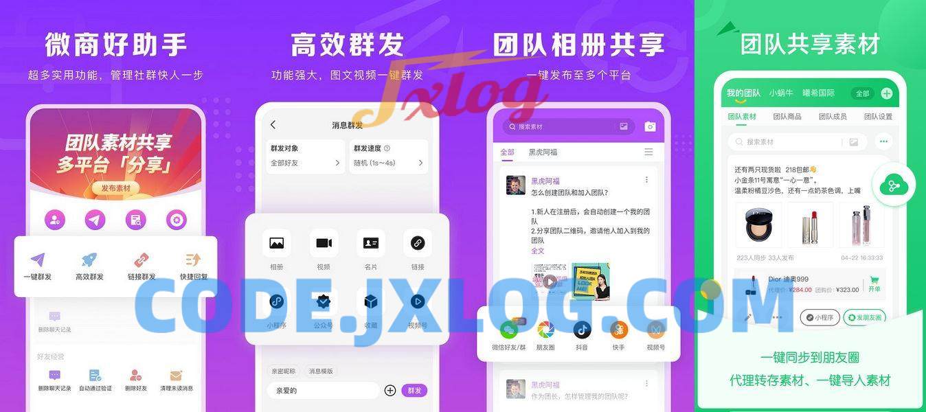 – 【群发助手】:多样化的群发选项,包括图文、小程序、公众号和文章,能面向好友及社群快速群发,扩大消息曝光范围,加速销售推广。