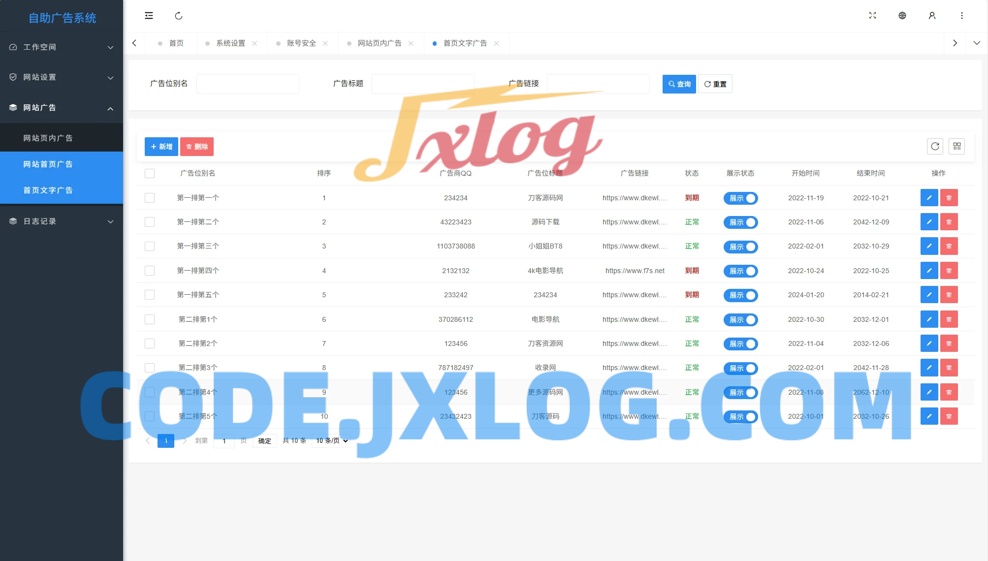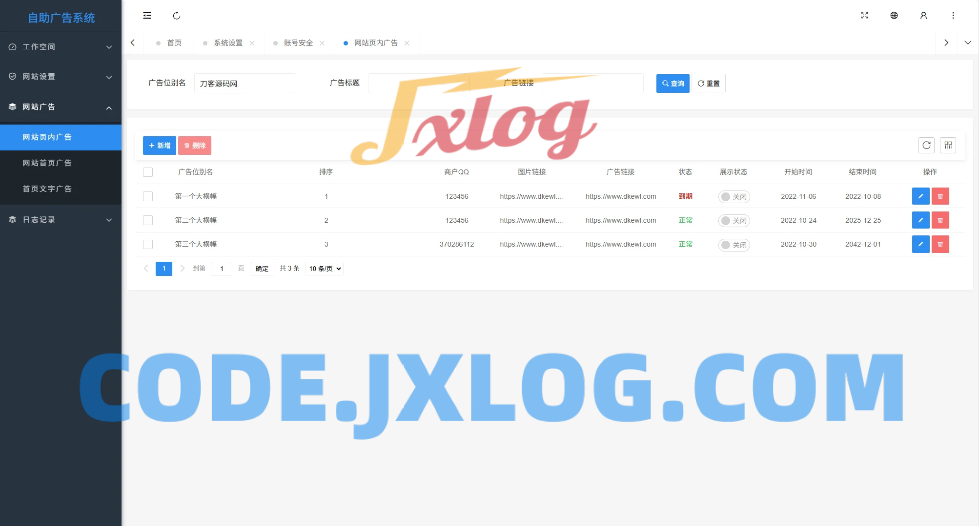 然后在广告系统后台设置各个广告位到期时间,广告位分 大横幅通栏广告,小横幅广告和文字广告。