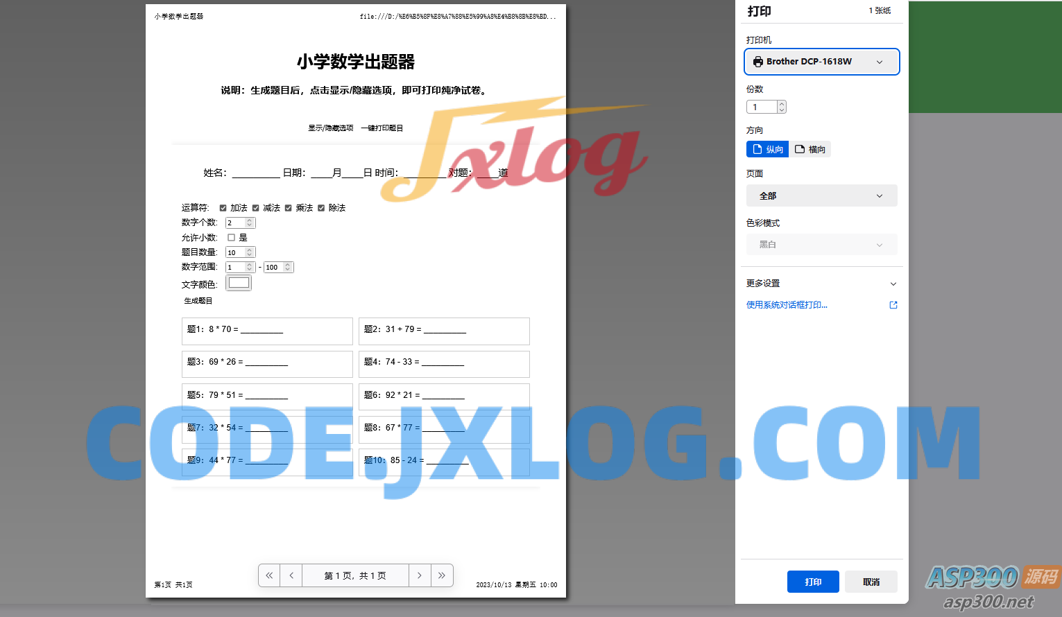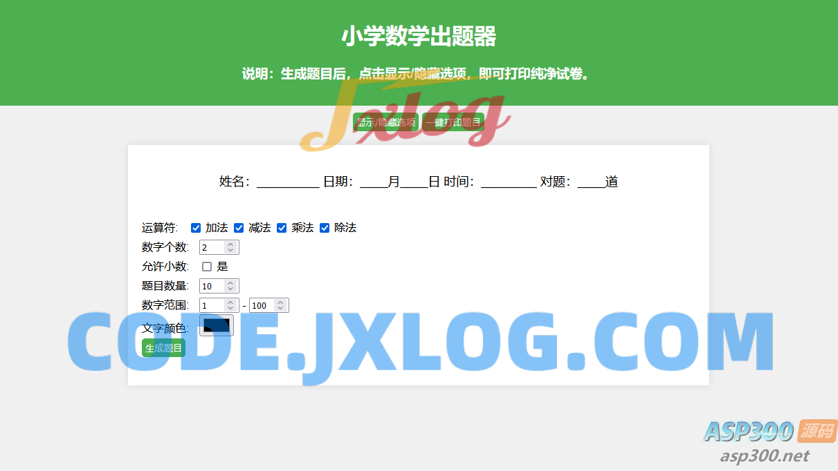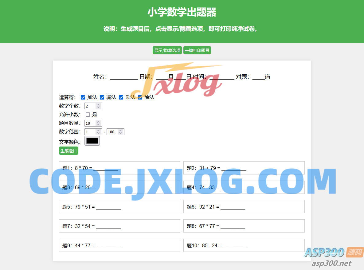 小学数学出题网页版源码,加减乘除混合运算,支持自定义数字、小数、混合运算,支持加减乘除运算混合多选(一道题中同时随机出现加减乘除运算符)支持自定义出题数量,支持一键打印成pdf,支持隐藏选项功能,打印纯净试卷,小学数学没有负数,保证结果不出现负数,出题分列展示、新增答案下划线,支持小数运算(不建议数字设置太大,毕竟小学生运算能力有限),支持姓名、日期、打分等。